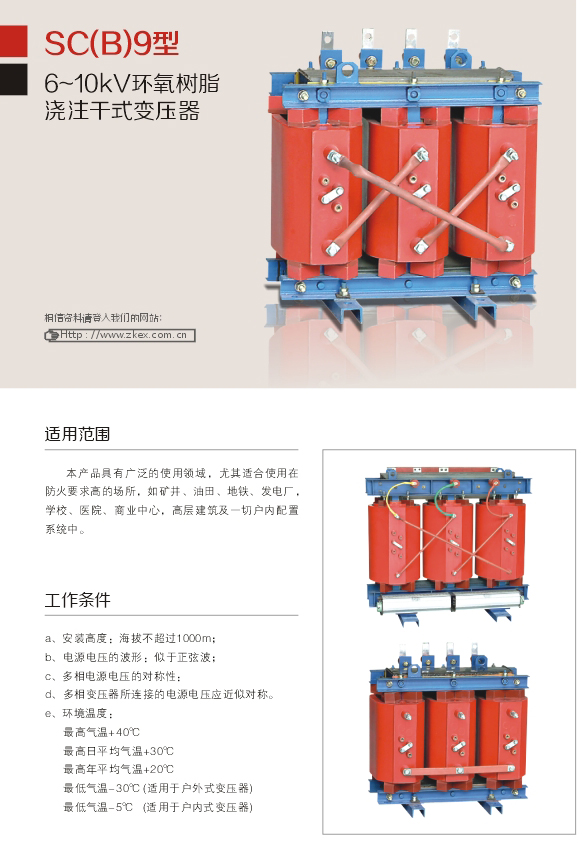 SC(B)9型6-10kv環氧樹脂澆注干式變壓器具有廣泛的使用領域,尤其適合使用在防火要求高的場所,如礦井、油田、地鐵、發電廠.學校、醫院、商業中心,高層建筑及-切戶內配置系統中。
